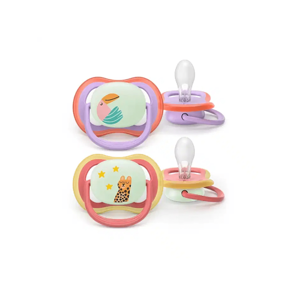Met de Avent Air Night fopspeen in toekan- en poesdesign hoef je nooit meer te zoeken in het donker dankzij het lichtgevende handvat. De luchtige vorm voorkomt irritatie en de stevige siliconenspeen blijft comfortabel, ook bij intensief gebruik. Een speelse en praktische keuze die rust brengt, zowel overdag als ’s nachts.