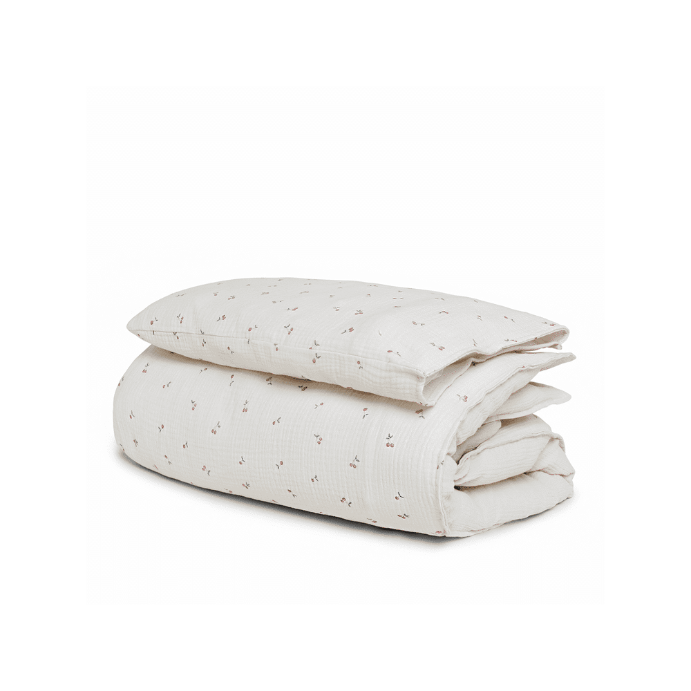 Het Cherries dekbedovertrek is gemaakt van hoogwaardig, ademend materiaal dat zacht aanvoelt op de huid van je baby. Het vrolijke kersenmotief zorgt voor een charmante uitstraling en comfortabel en stijlvol slapen gedurende de nacht.