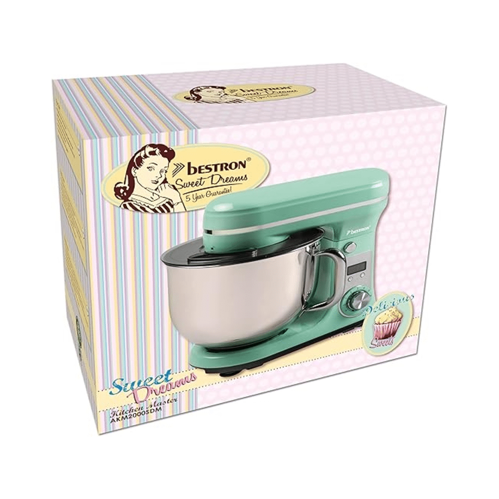 Met de Bestron Sweet Dreams keukenmachine in munt maak jij elk bakmoment leuker, makkelijker en smakelijker. Perfect voor elke thuisbakker die houdt van stijl én gemak.Bestron Sweet Dreams keukenmachine in munt
