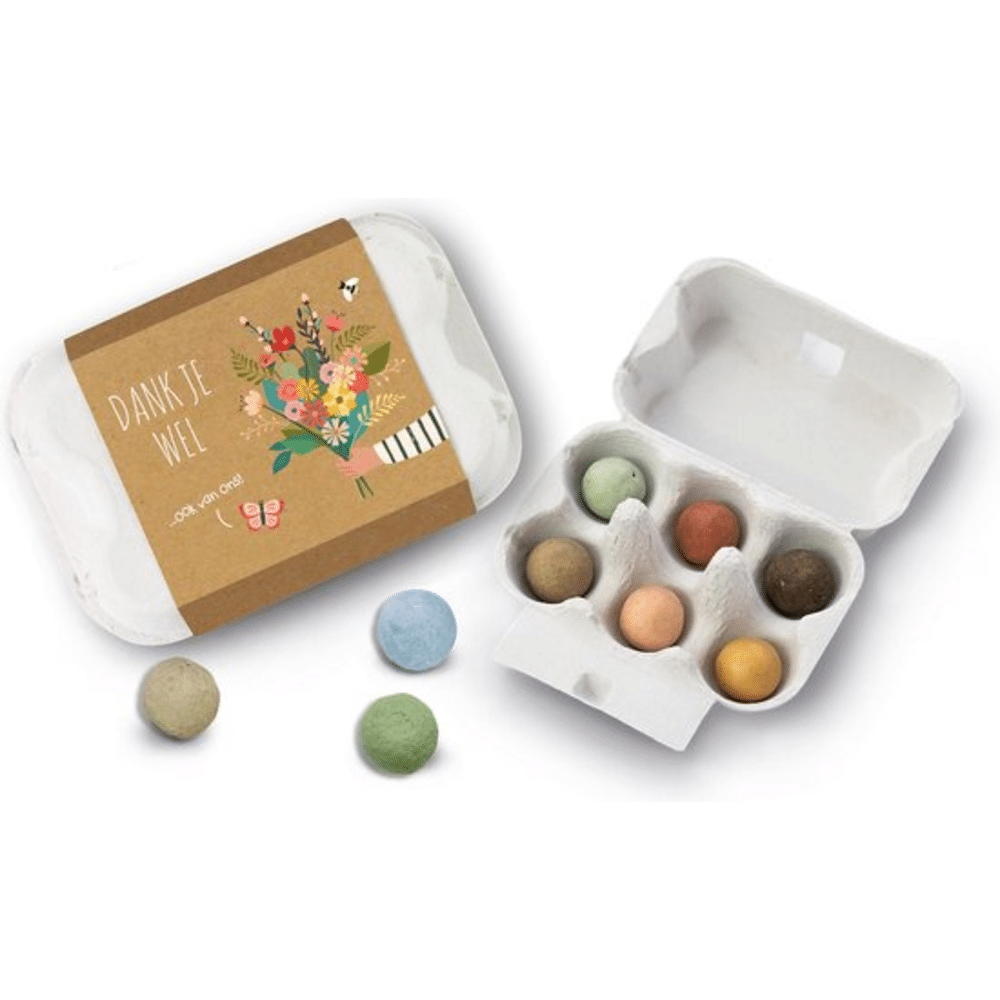 Bedank iemand op een unieke en natuurlijke manier met het Blossombs Eierdoosje ‘Dank je wel’. In deze charmante verpakking zitten 6 kleurrijke bloembommetjes die na het planten uitgroeien tot een bloemenweelde. Elke bommetje staat symbool voor een oprechte dankbetuiging. Het eierdoosje straalt eenvoud uit en is gemaakt van gerecycleerd materiaal – een puur, duurzaam en hartverwarmend gebaar.