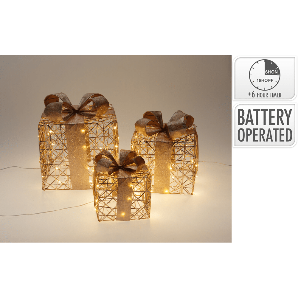 Een stijlvolle cadeauset in goud met geïntegreerde LED-verlichting, perfect als geschenk of decoratief element tijdens feestdagen. De set straalt luxe en warmte uit.
