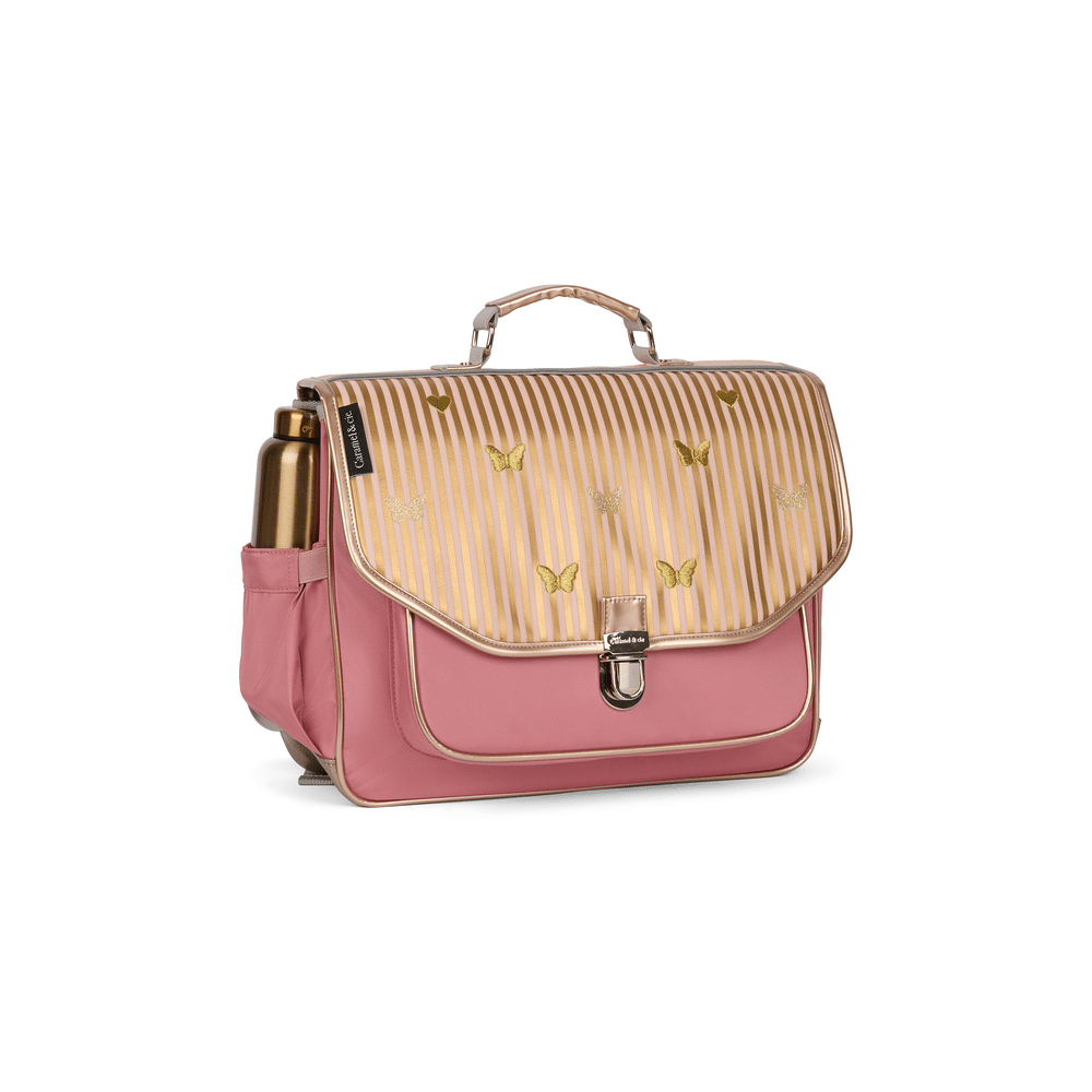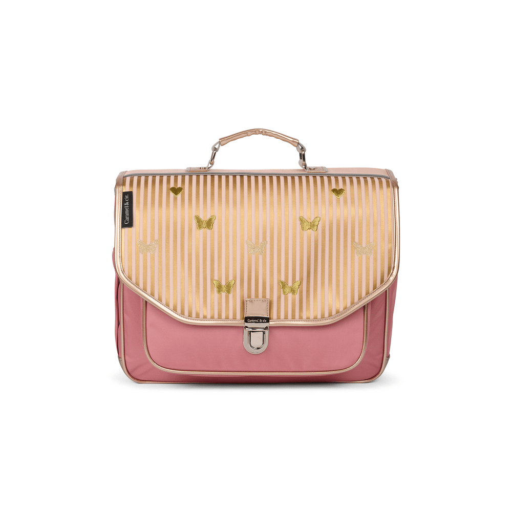 De combinatie van muziek geïnspireerd design en verfijnde details maakt deze boekentas echt uniek. De glinsterende vlinders en gouden hartjes zorgen voor een speelse uitstraling, terwijl de elegante strepen het geheel mooi in balans brengen.