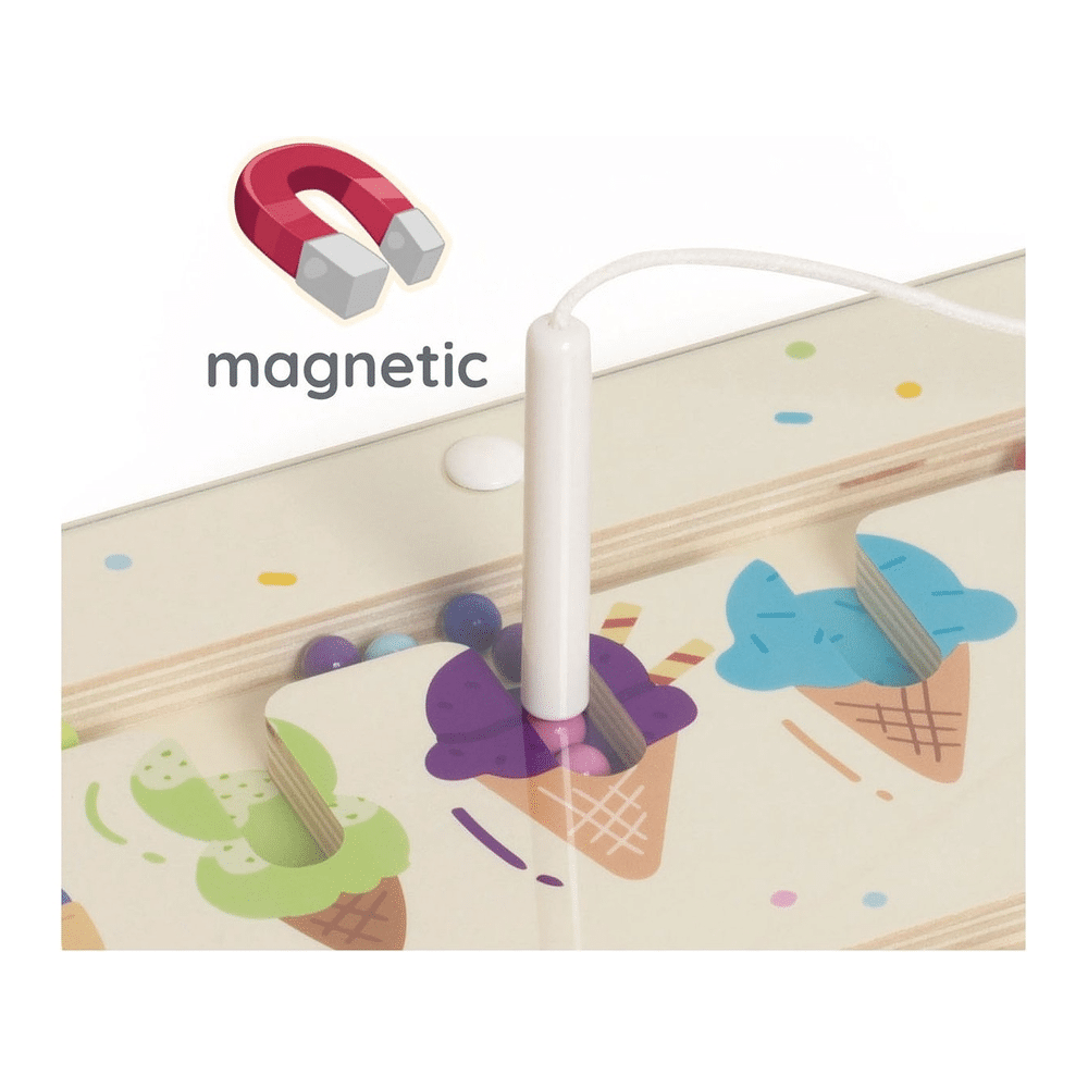Met dit interactieve spel leert je kindje kleuren herkennen en fijne motoriek oefenen.- Houten ijskar met kleurrijke bolletjes