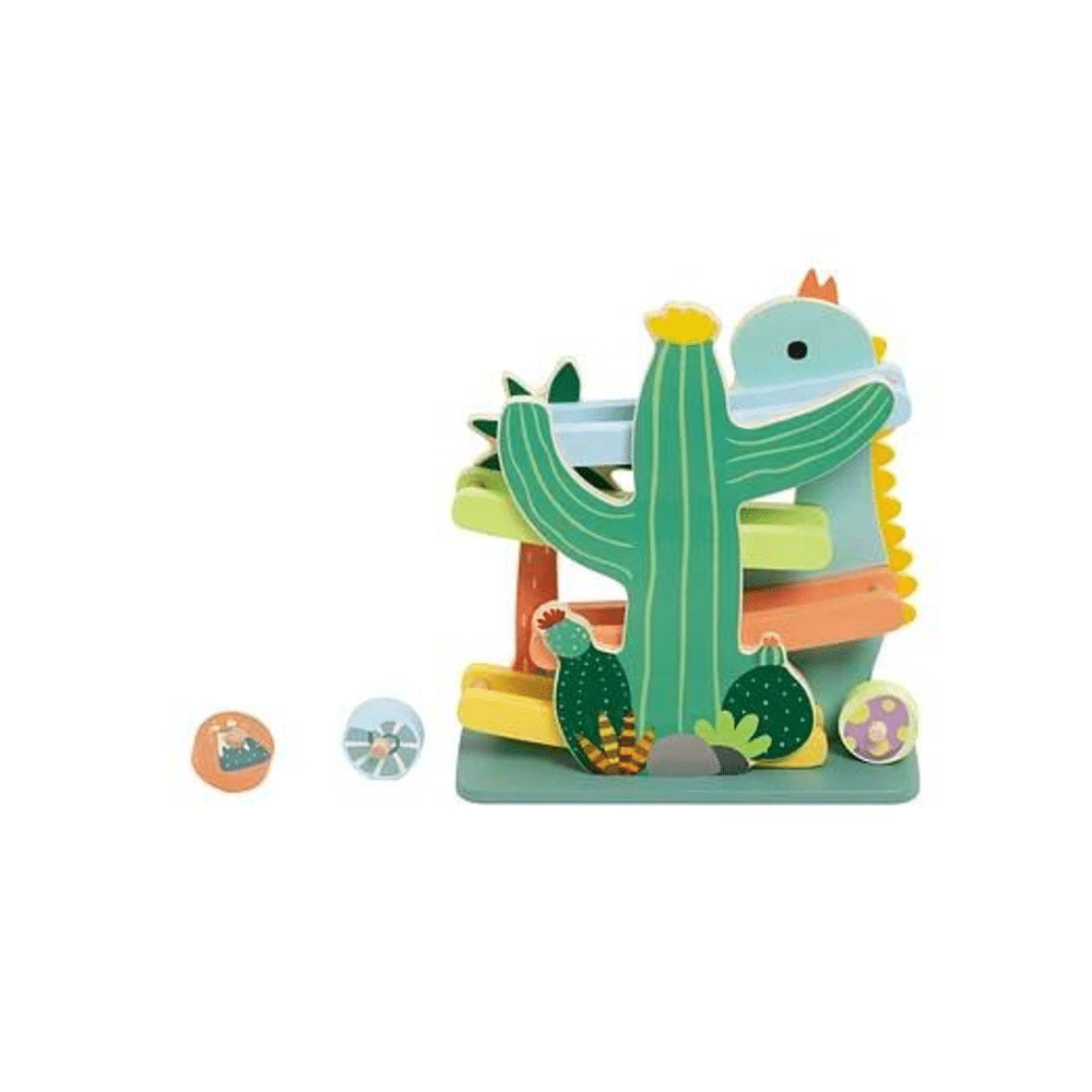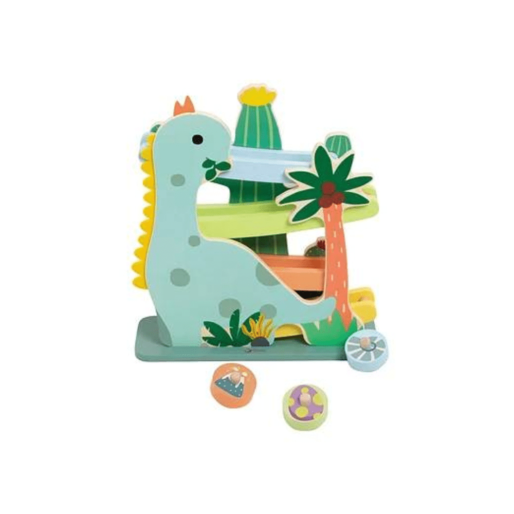 Met zijn interactieve ontwerp stimuleert hij fijne motoriek, oog-handcoördinatie en verbeelding.- Houten ballenbaan met vrolijke dinosaurus