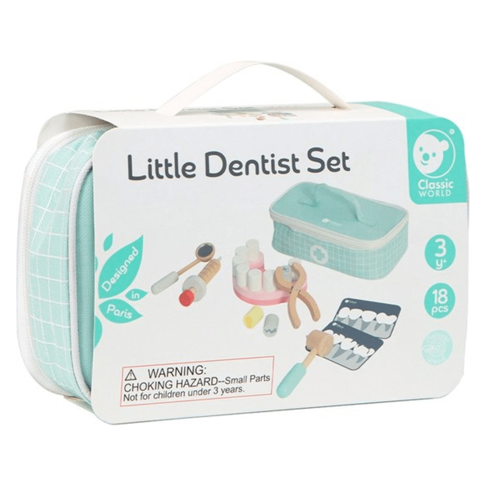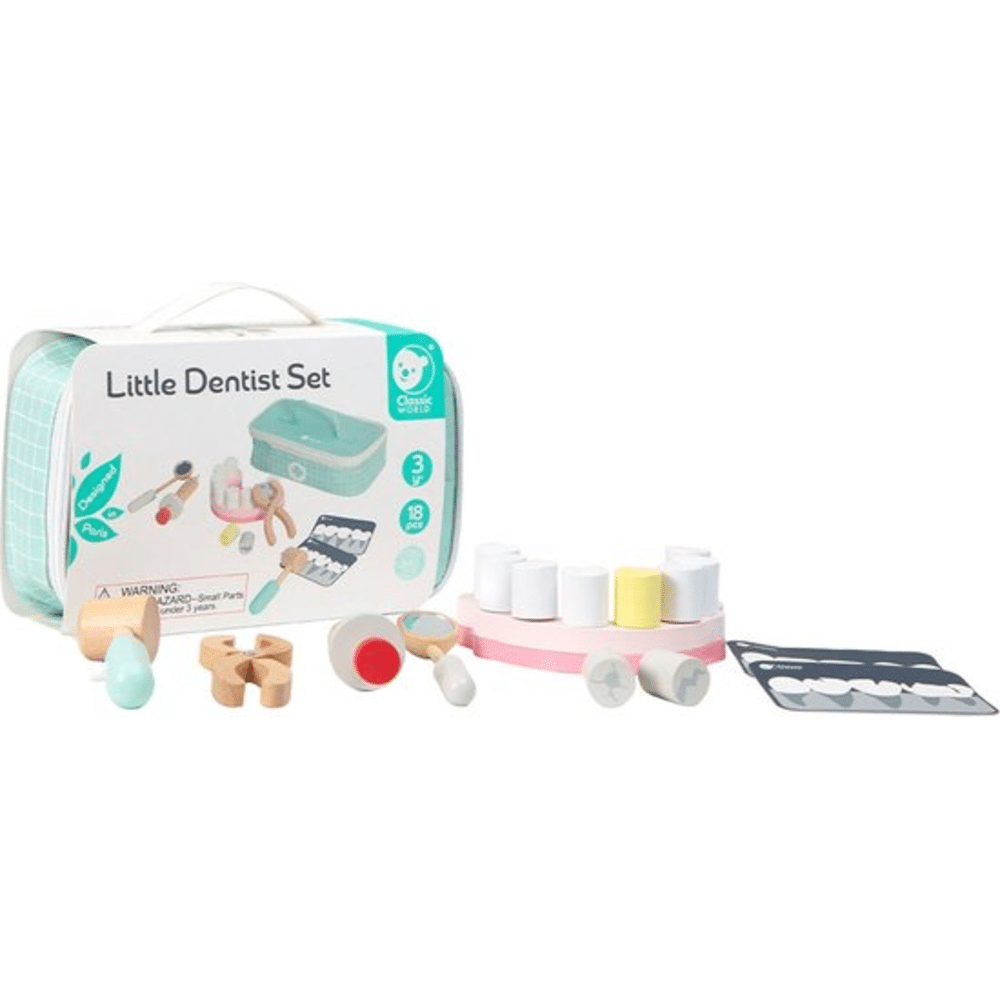 Laat je kindje leren en spelen met de Classic 50556 Speelset Hout Tandarts. Een 18-delig koffertje met alle tandartsaccessoires en tanden, perfect voor kinderen vanaf 18 maanden.Waarom deze tandartsset zo leuk is