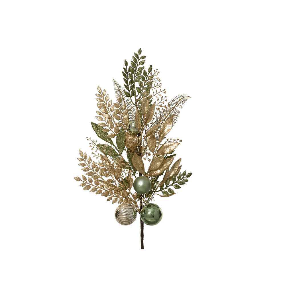 Breng instant kerstsfeer in huis met deze Decoris spray - een sierlijke kersttak/kunsttak die je interieur in één klap een luxueuze upgrade geeft. De rijke mix van groen en goud met subtiele glitter laat je woonkamer, hal of feesttafel stralen. Jij combineert ’m moeiteloos met je andere kerstdecoratie: van kransen en boeketten tot tafelstukjes en vazen. Dankzij de speelse combinatie van mat, glans en sprankelende glitter oogt hij tegelijk chique én feestelijk. Ideaal om die warme, gezellige eindejaarssfeer te creëren waar je zo van houdt. Gebruik hem solo als blikvanger of werk je kerststuk, guirlande of bloemarrangement ermee af - jij kiest!