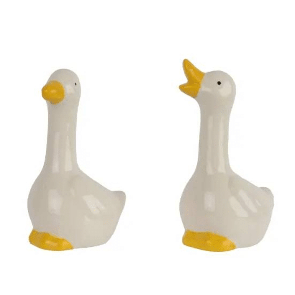 Deze gans van porselein met afmetingen 7,3cm lengte, 6,1cm breedte en 12,1cm hoogte in off-white is een elegant en speels decoratief accent. Verkrijgbaar in 2 assorti designs, ideaal voor op tafels, schappen of in een paasdecoratie.