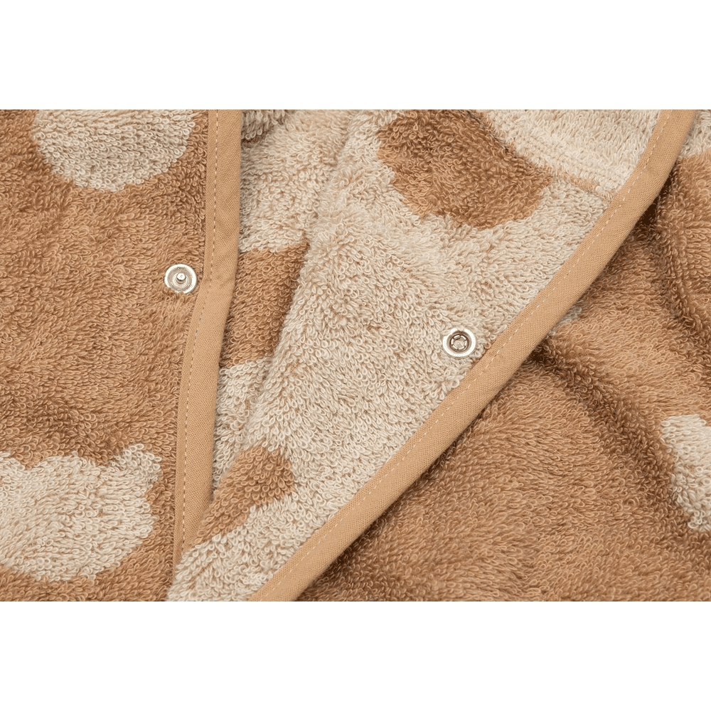 De badjas heeft slimme details die het leven makkelijker maken. De ceintuur zit vast aan het jasje, dus die raak je nooit meer kwijt. Het elastiek in het rugpand zorgt voor een fijne pasvorm die beweegt met je kindje mee. Het drukknoopje houdt de badjas goed dicht tijdens het dragen.Wat zijn de eigenschappen?