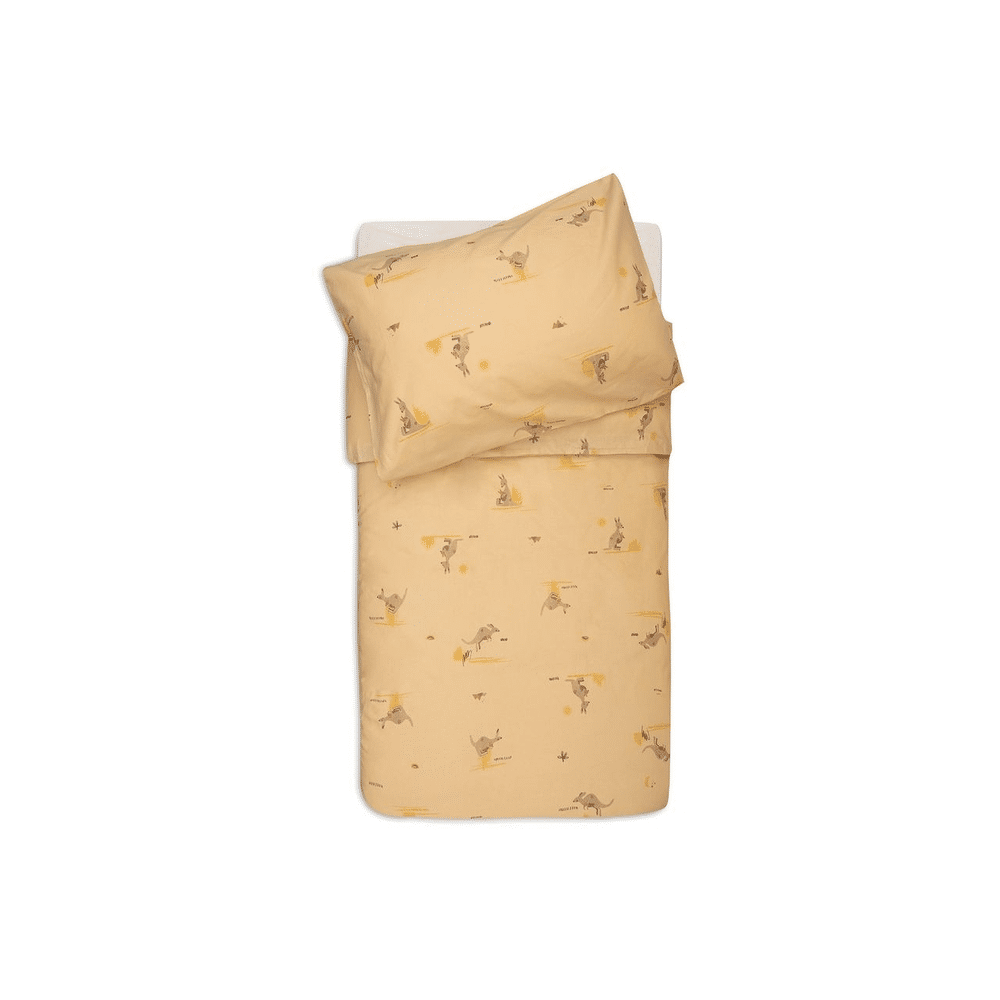 Het overtrek van 100x140 cm is perfect voor een kinderbed. Zowel het dekbedovertrek als de bijpassende sloop hebben aan beide kanten dezelfde lieve kangoeroeprint. Zo blijft de sfeer knus, hoe je kindje ook woelt. Het 100% katoenen materiaal ademt goed en voelt zacht aan op de huid.Hoe onderhoud je dit dekbedovertrek?