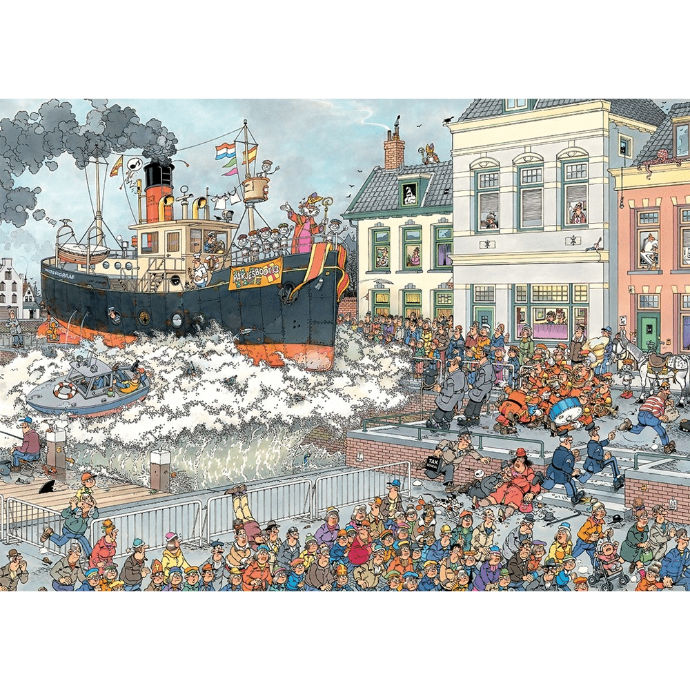 Ben jij klaar voor een doldwaze puzzel vol verrassingen? Met de Jan van Haasteren Sinterklaas Intocht puzzel van 1000 stukjes duik je middenin een knotsgek feest waar niets loopt zoals gepland. Terwijl Sinterklaas zijn grootse entree maakt per stoomboot, gooit een gigantische golf roet in het eten. Resultaat? Pure chaos én heel veel plezier aan de puzzeltafel!