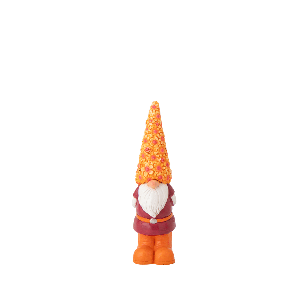 Deze kabouter met bloemenhoed is gemaakt van duurzaam magnesium en heeft afmetingen van 19 x 15 x 61 cm. Perfect voor tuindecoratie, plantenbakken of opvallende interieuraccenten.