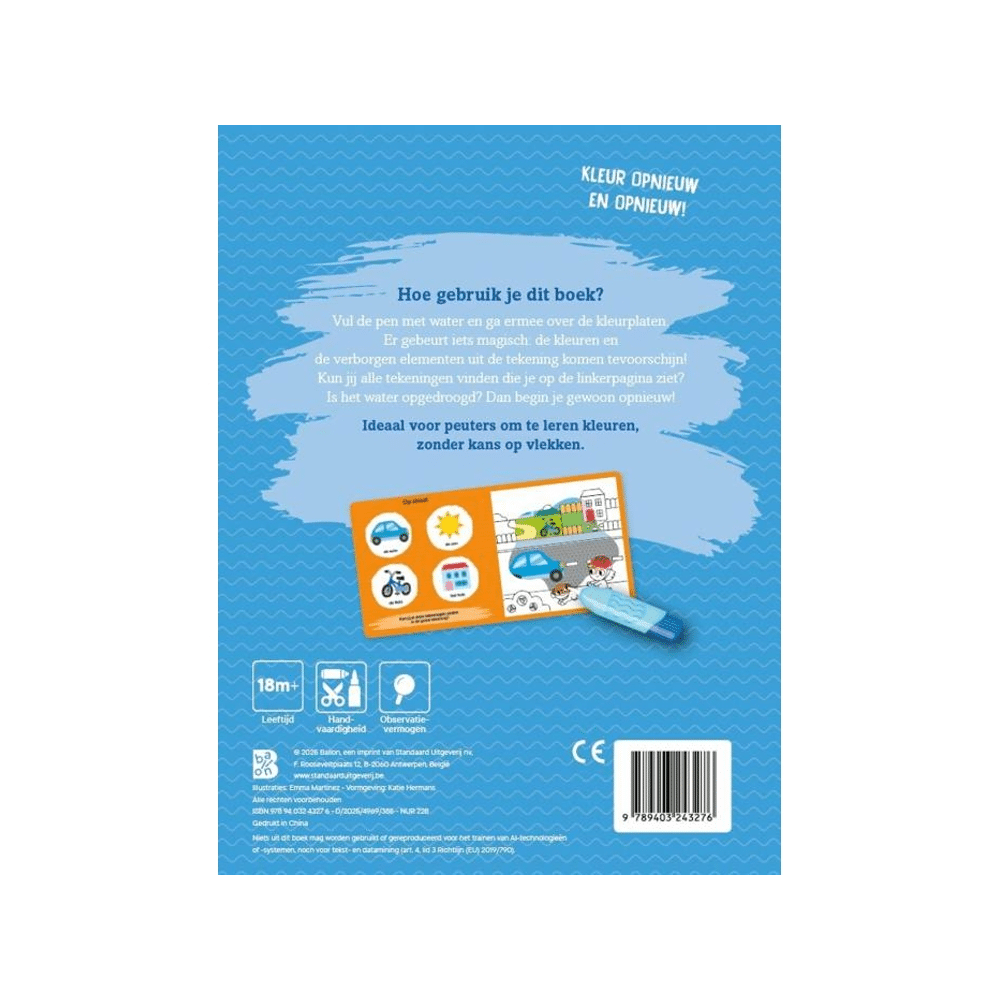 Een educatief en interactief kleurboek voor jonge kinderen om eerste woordjes te leren terwijl ze kleuren. Met waterverf verschijnen de afbeeldingen en woorden langzaam, wat spelenderwijs taalontwikkeling en concentratie bevordert.