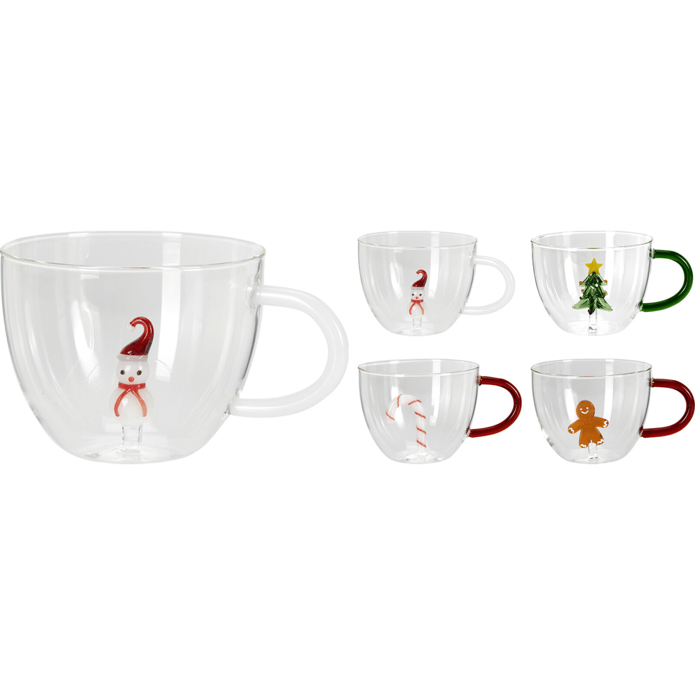 Dit assortiment van 4 glazen kopjes is een streling voor het oog én het hart. Elk kopje heeft een uniek kerstdesign, van sneeuwman tot kerstboom, zodat je tafel er altijd feestelijk uitziet. Ideaal voor je favoriete espresso of een warme chocolademelk na een winterwandeling.Laat de feestdagen fonkelen