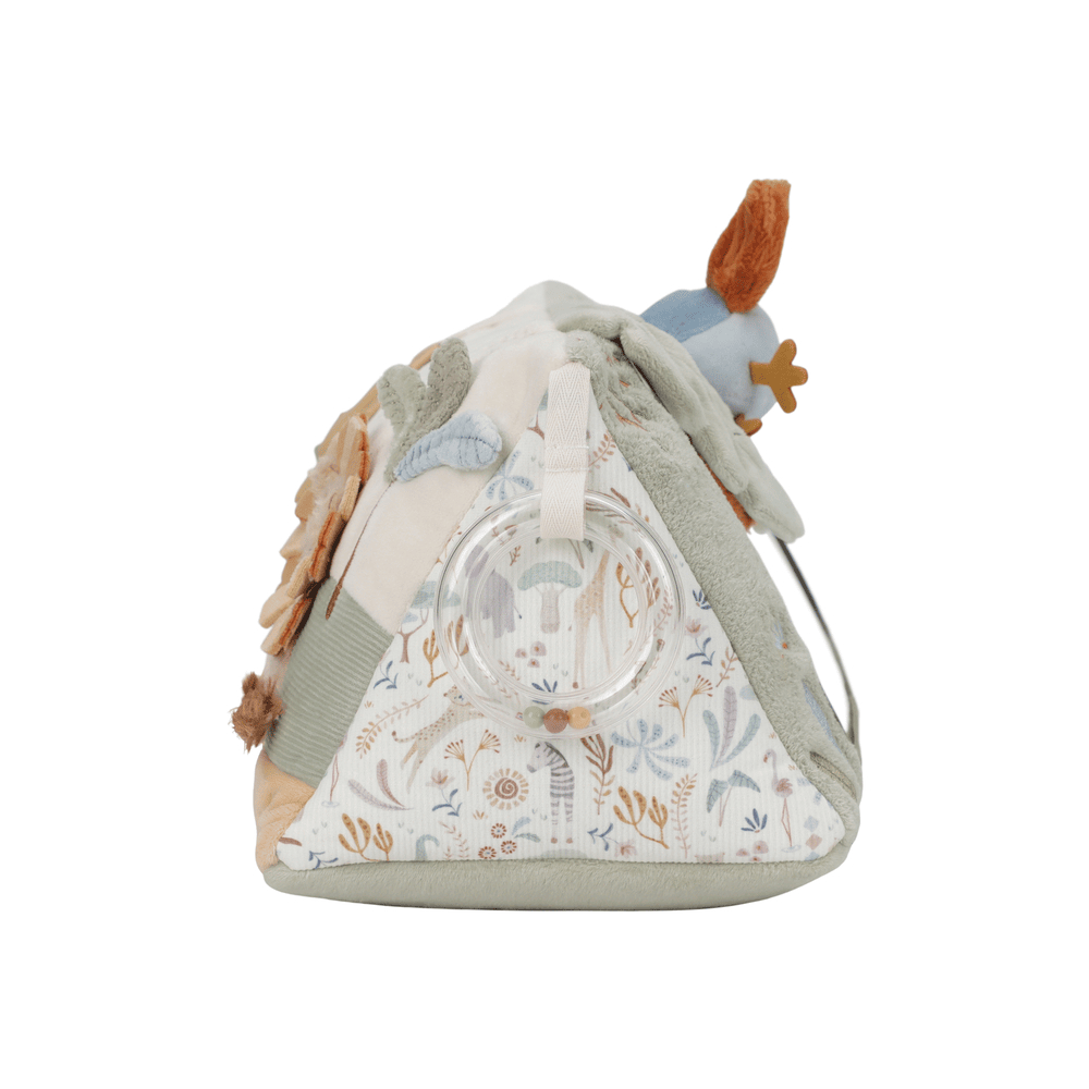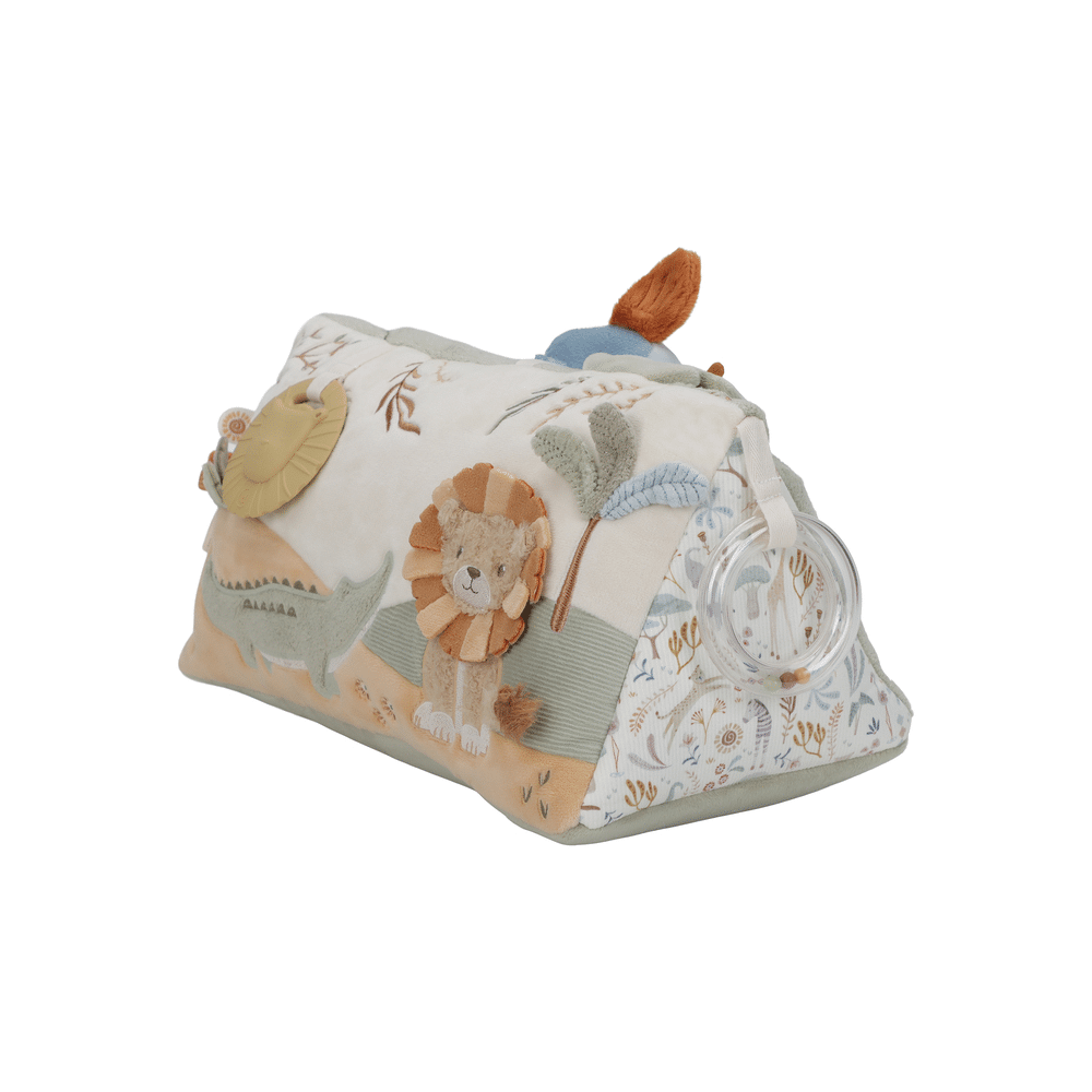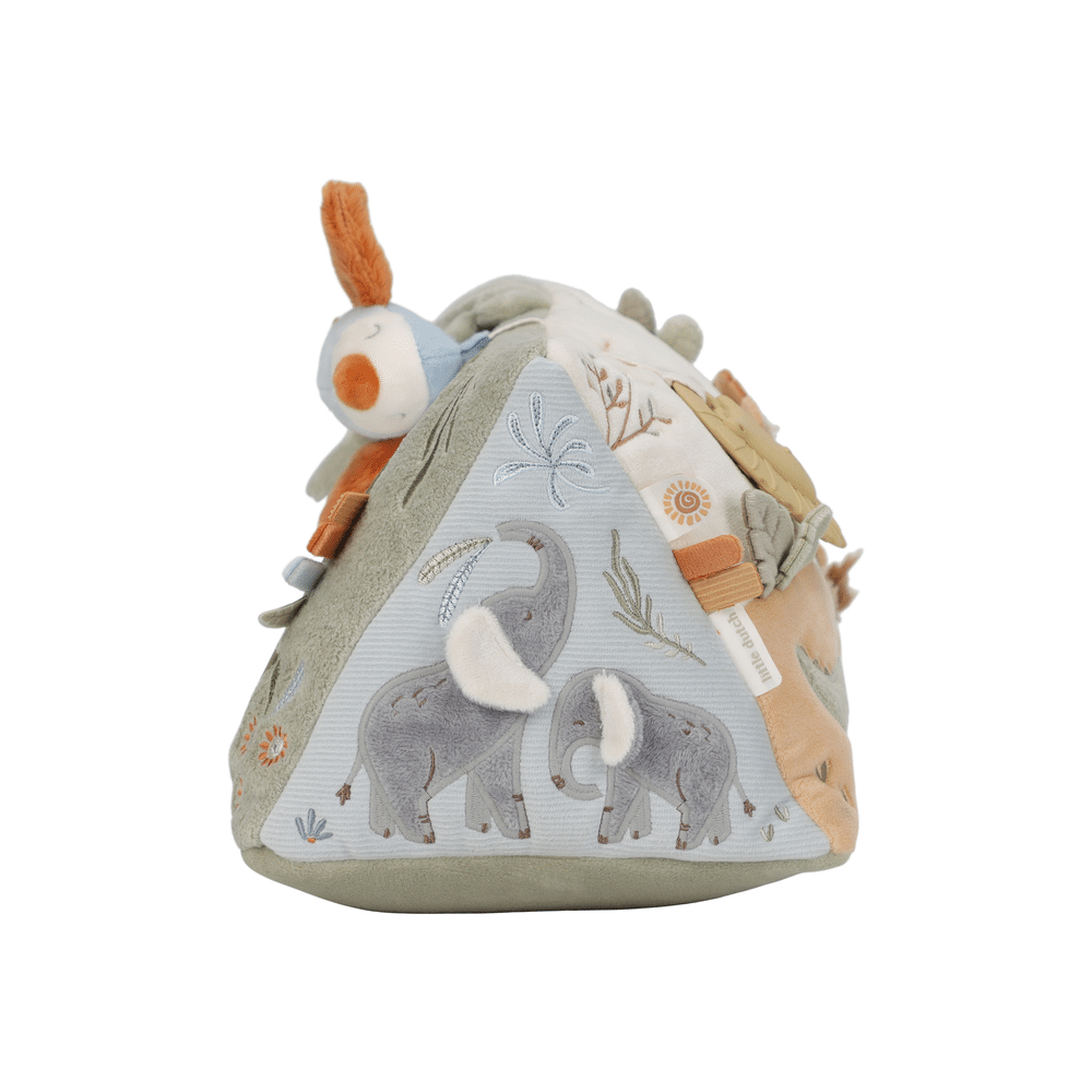 De Little Dutch Safari Friends Activiteitendriehoek is een veelzijdig speelmaatje dat je baby uitdaagt om te voelen, grijpen en ontdekken. Dankzij de verschillende speelelementen wordt elke zijde een nieuw avontuur.
