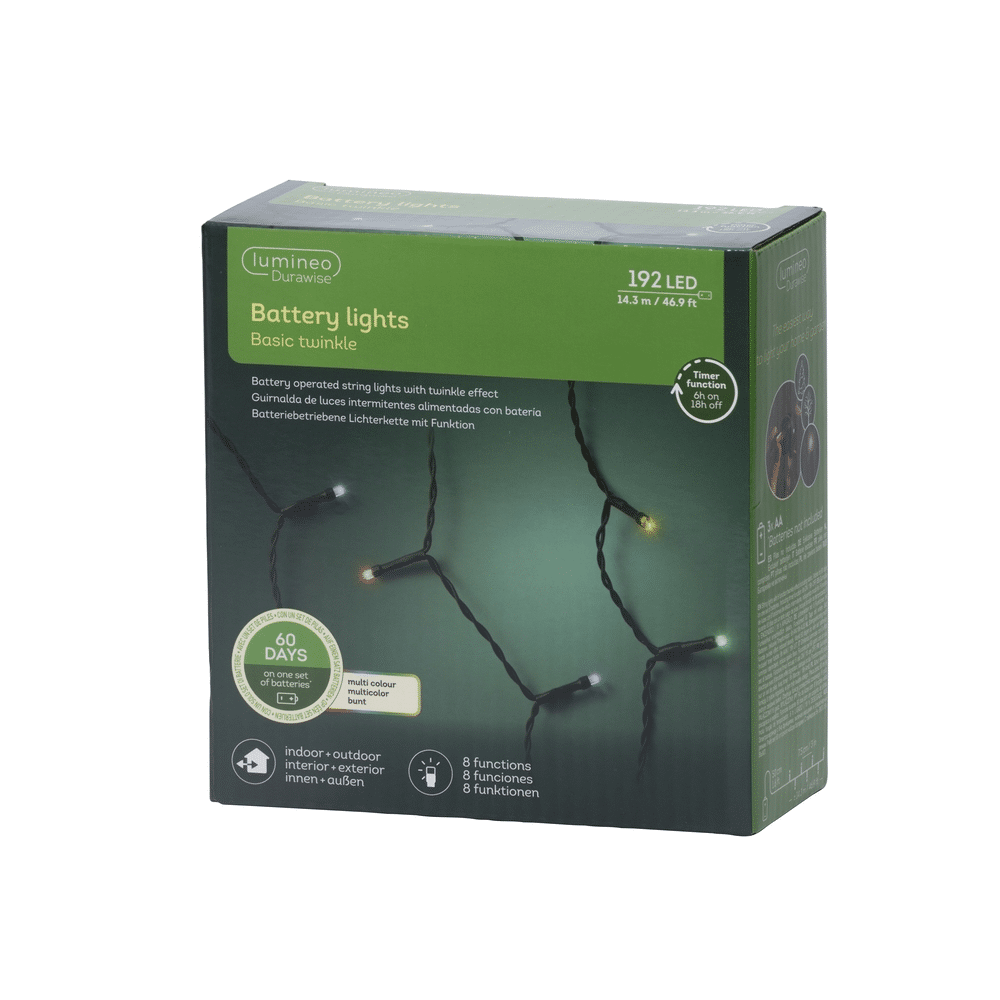 • 192 vrolijke LED-lichtjes in multicolor (5 mm) met een betoverend twinkeleffect in 8 standen