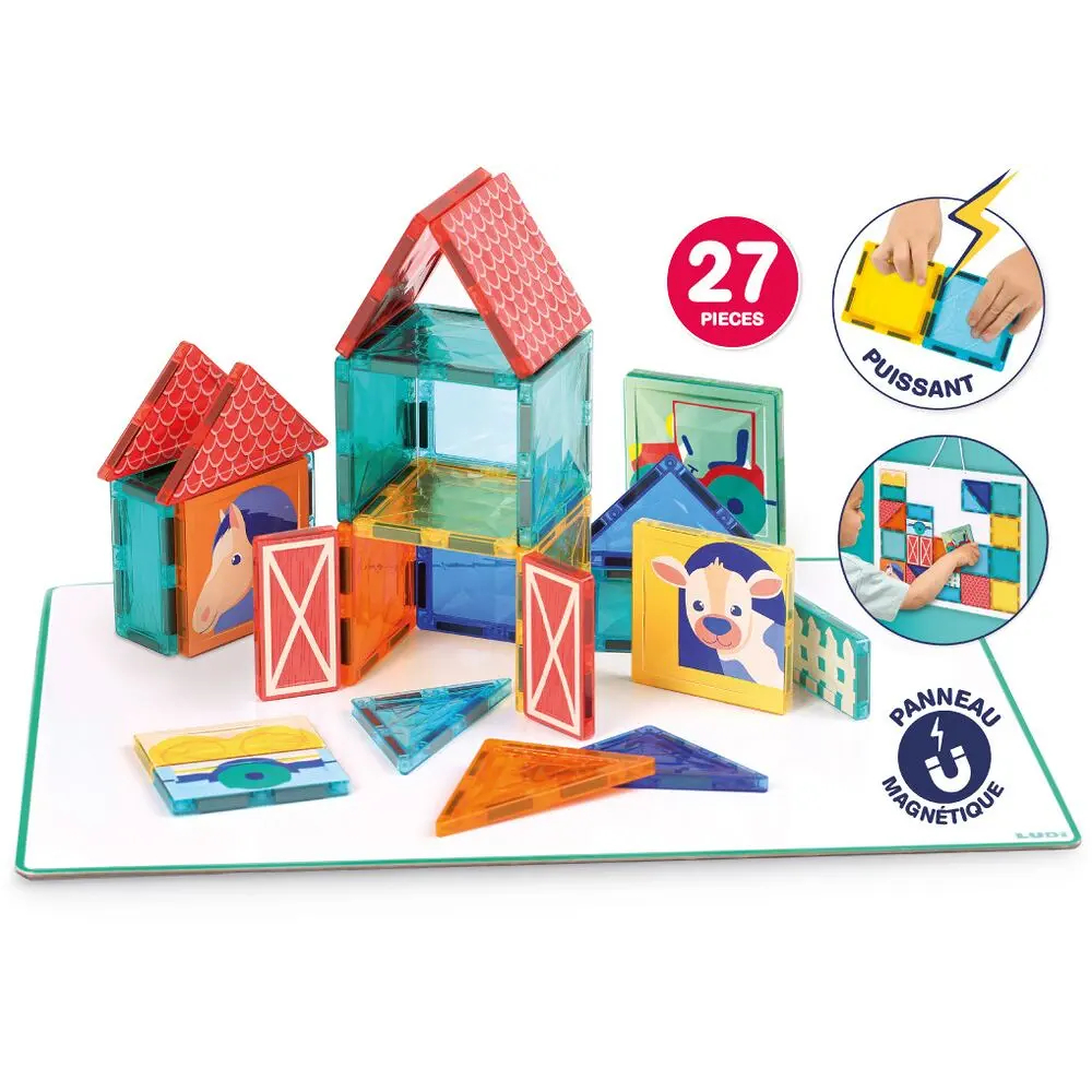 Dankzij het grote paneel en de 27 onderdelen bouwt je kind eindeloos nieuwe creaties. De transparante stukken zorgen voor een uniek kaleidoscoopeffect met prachtige licht- en kleurspelingen, terwijl de geïllustreerde stukken het boerderijthema tot leven brengen.