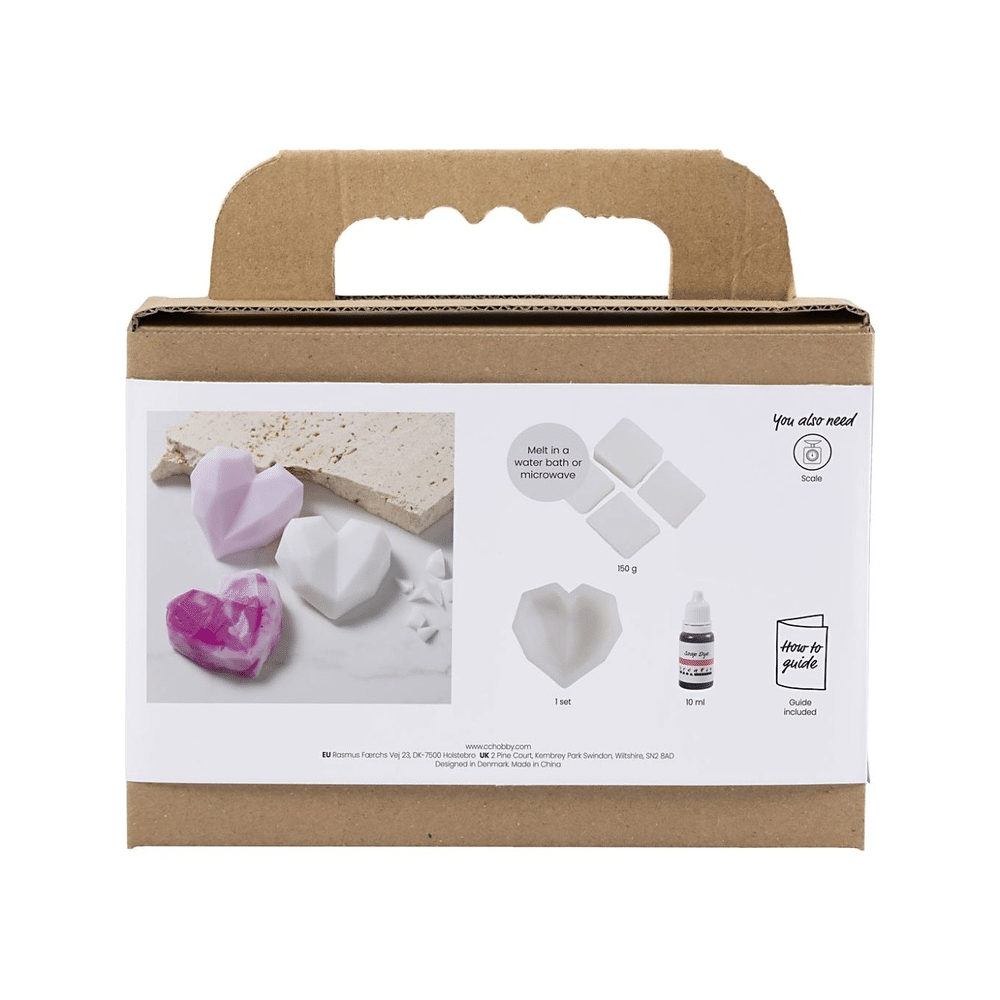 - Inhoud: zeepbasis, kleuren, geurstoffen en hartvormige mallen