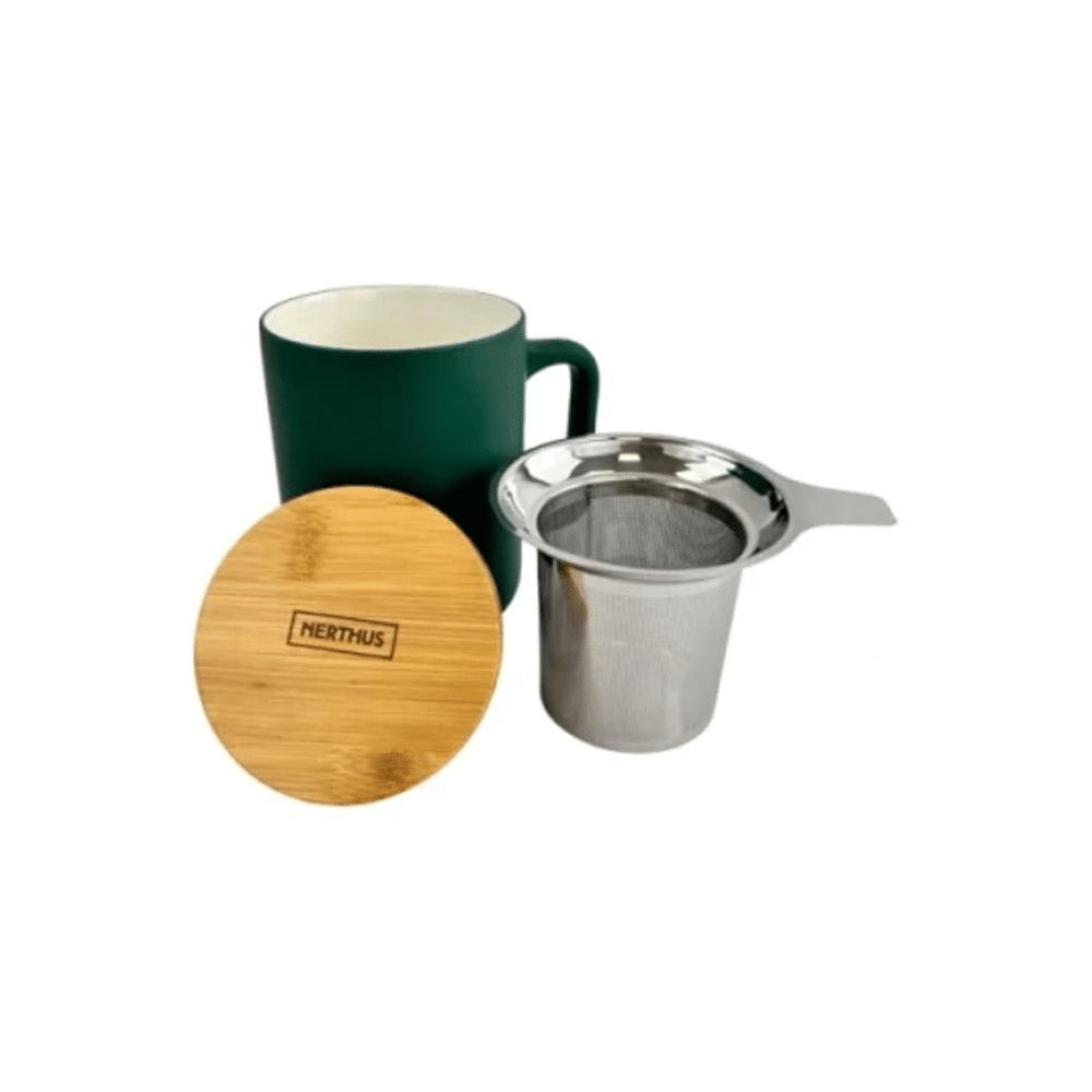 De Nerthus theetas met filter en bamboe onderzetter (groen) is perfect voor het stijlvol bewaren en serveren van thee. Ideaal voor losse thee, met een natuurlijke uitstraling en praktisch gebruiksgemak.