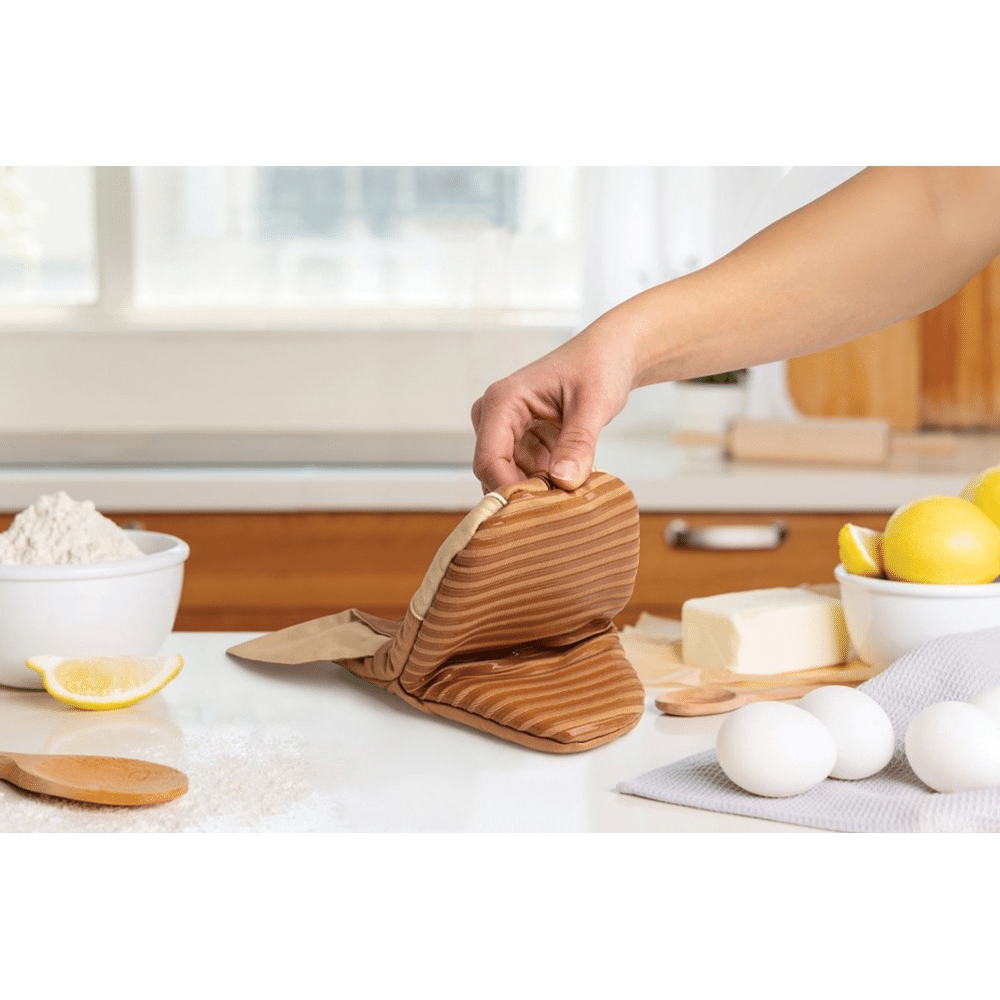 De ovenwanten bieden stevige hittebescherming zodat je heet servies makkelijk aankan.