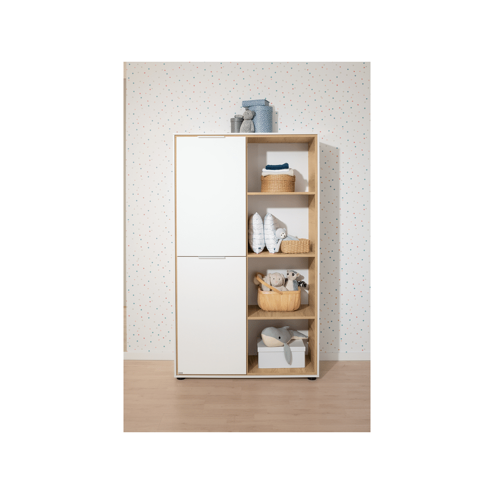 Met ruime opbergvakken en een lage hoogte is deze kast ideaal voor kinderen om zelfstandig spullen op te bergen. De stijlvolle afwerking maakt het een mooie toevoeging aan de kamer.