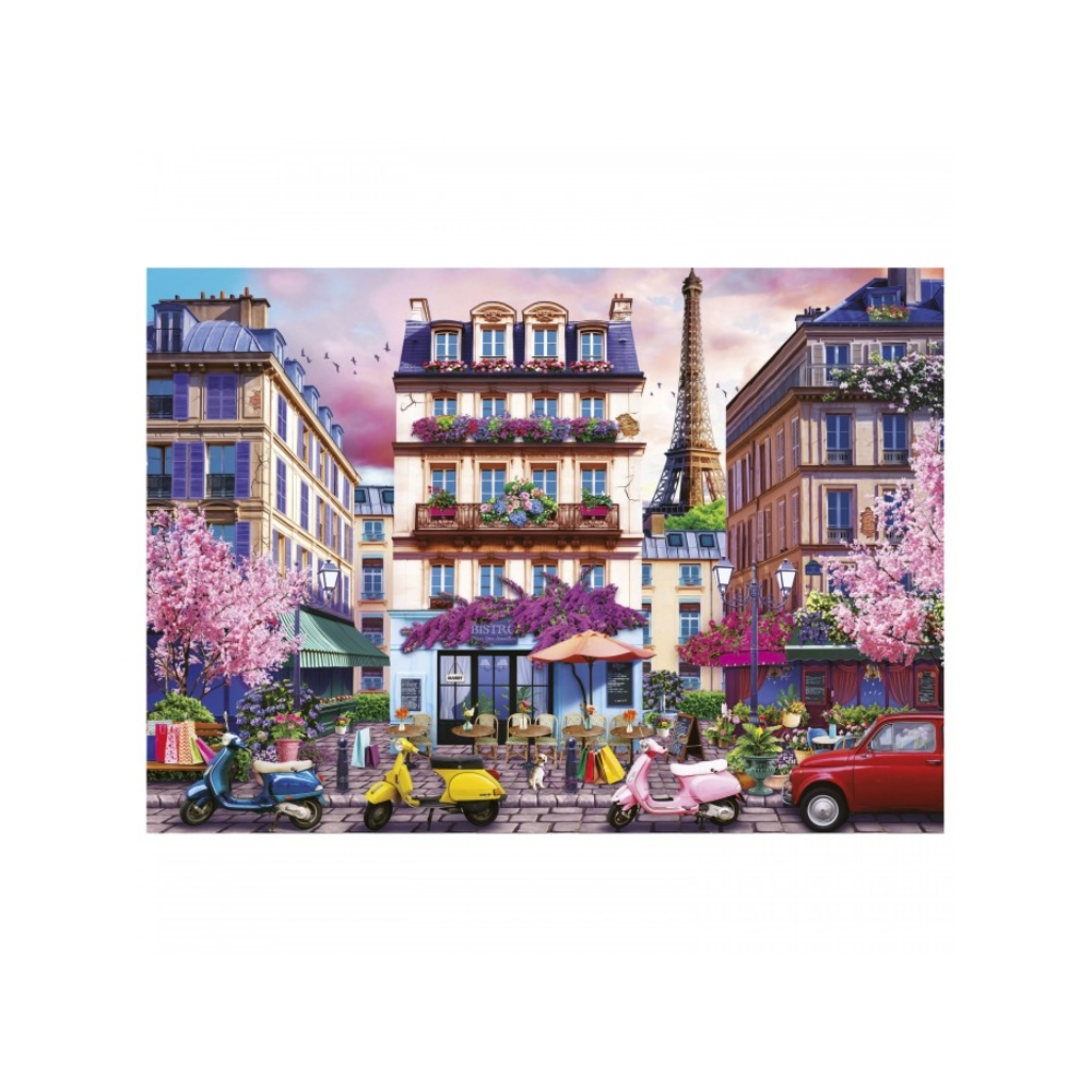 Laat je meevoeren naar de charmante straten van Parijs met deze sfeervolle puzzel van 500 stukjes. Je ontdekt een gezellig bistroterras, omringd door bloeiende gevels, pastel scooters en elegante details die meteen een warme, ontspannen sfeer oproepen.