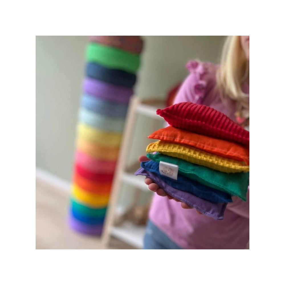 Kleurrijk plezier in roze tinten!Deze zachte pittenzakjes in regenboog- en roze kleuren zijn ideaal om te gooien, vangen en stapelen. Perfect voor kinderen en gezinnen die spel en motorische ontwikkeling willen combineren.