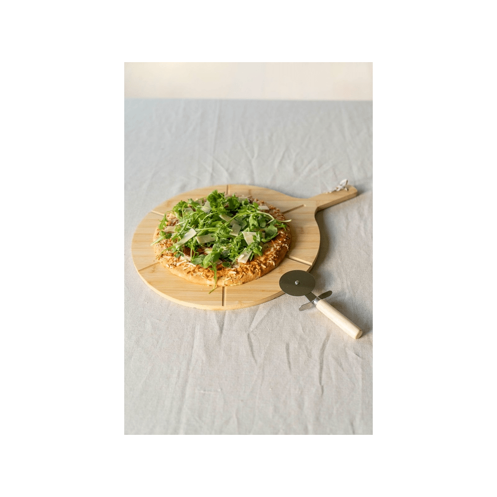 Leg je pizza op de plank van bamboe en snij met de roestvrije pizzasnijder. Perfect voor familieavonden, feestjes of gewoon een snelle snack.