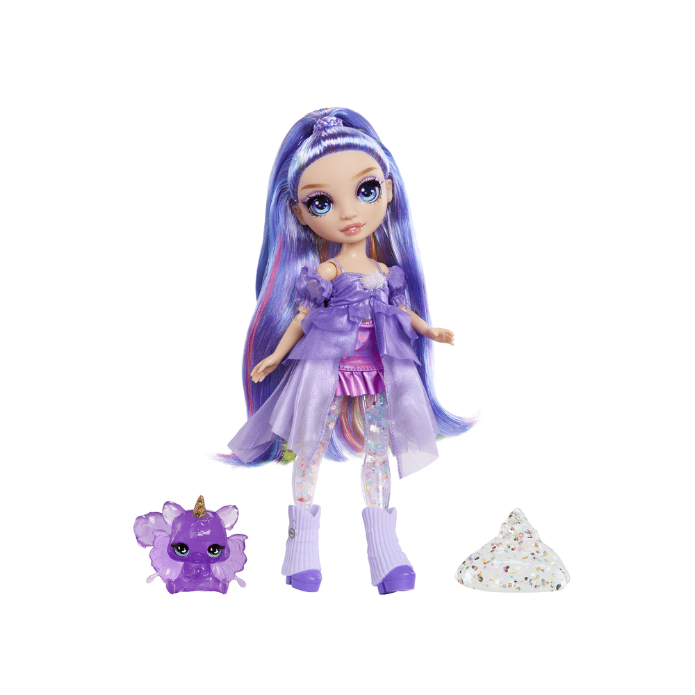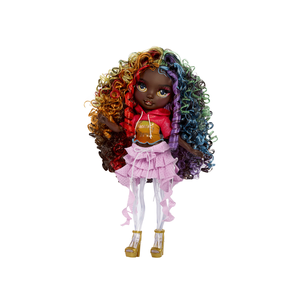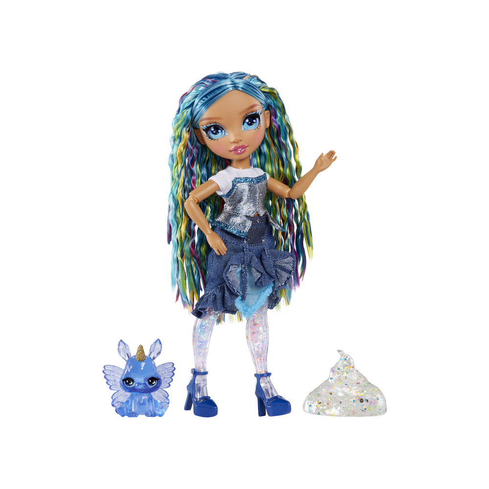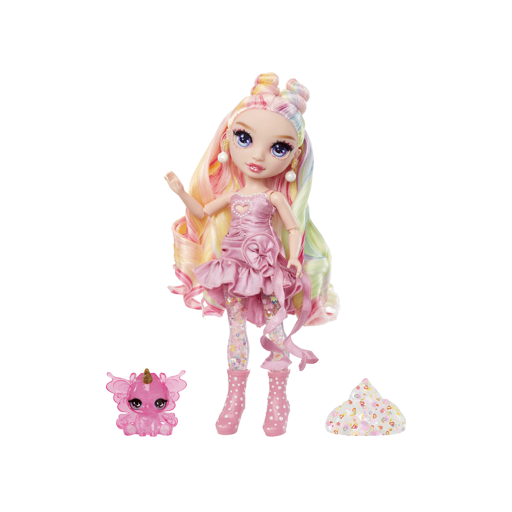• Inhoud: 28 cm modepop met aanpasbare benen, complete outfit, regenboogslijmset, magisch diertje en kam