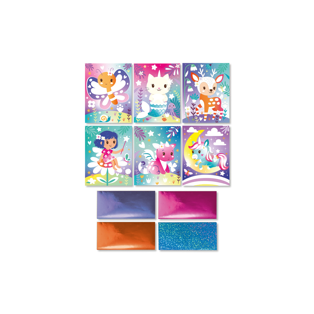 Met deze creatieve knutselset maak jij in een handomdraai betoverende sprookjeskunst. Door simpelweg delen van de kaarten af te pellen en folie aan te brengen, ontstaan glinsterende figuren die meteen tot de verbeelding spreken. Ideaal voor kinderen vanaf 5 jaar die graag creatief bezig zijn.