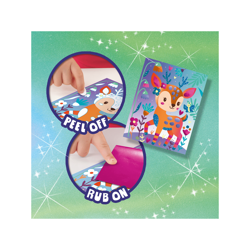 Het systeem is eenvoudig en leuk: je pelt de stickers, legt de folie erop en wrijft zachtjes met je vingers. Dankzij de voorgedrukte stickerkaarten krijg je altijd een prachtig resultaat zonder frustratie.