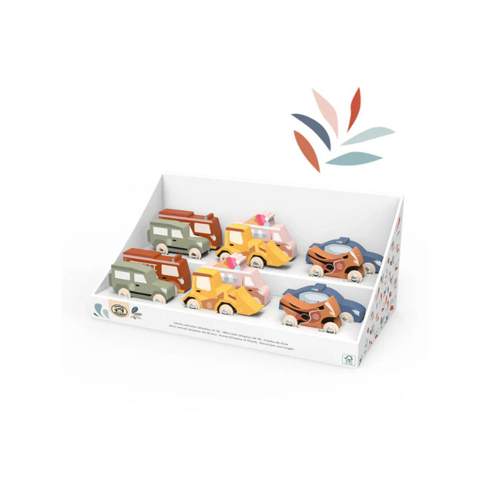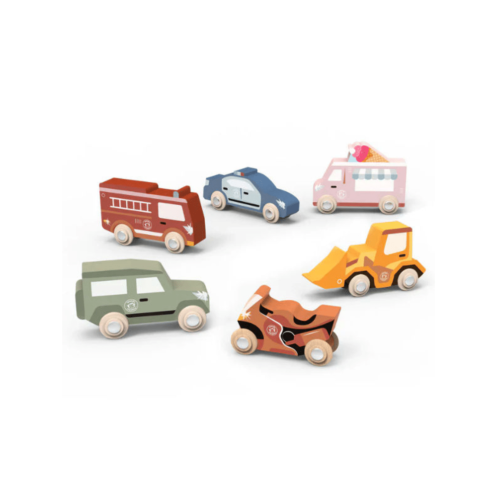• Set van stevige houten voertuigen in vrolijke kleuren