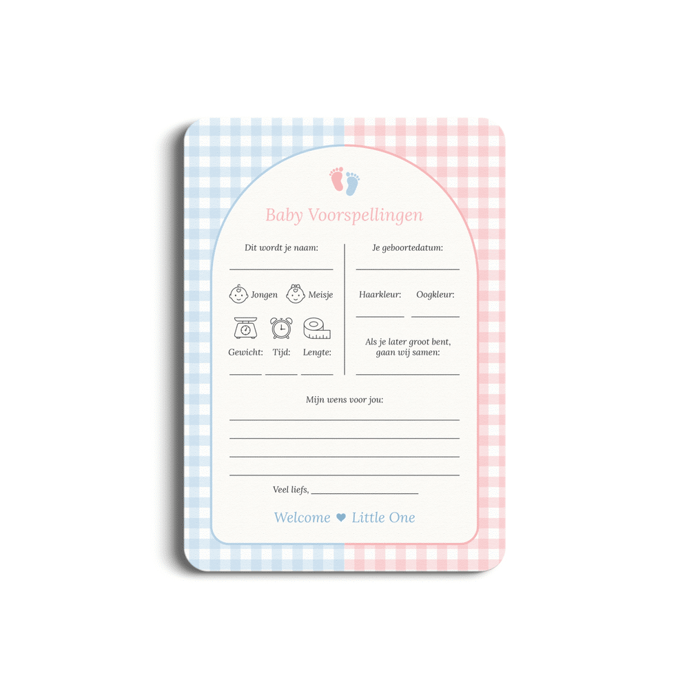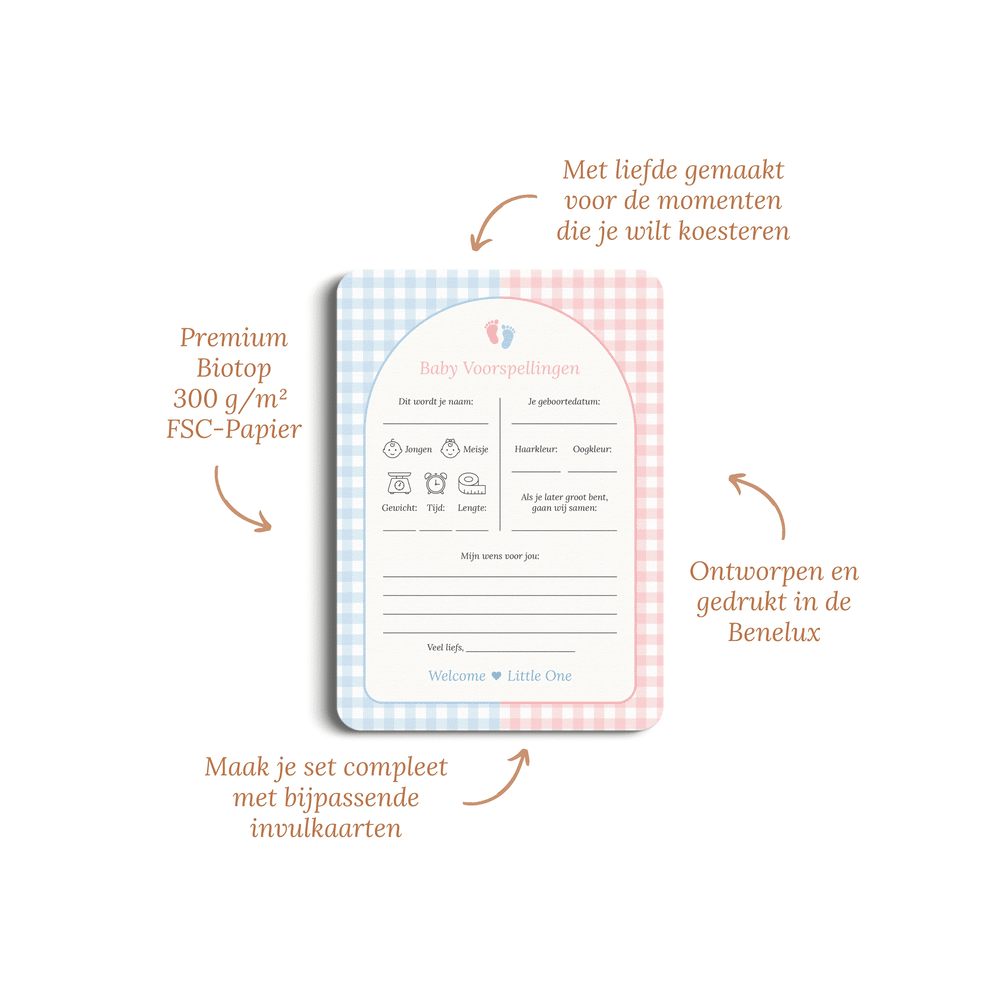 De Studio Miron Baby Voorspellingen Gingham Roze Blauw combineren kwaliteit, design en emotie. Een stijlvolle en duurzame herinnering aan een bijzonder babyfeest.