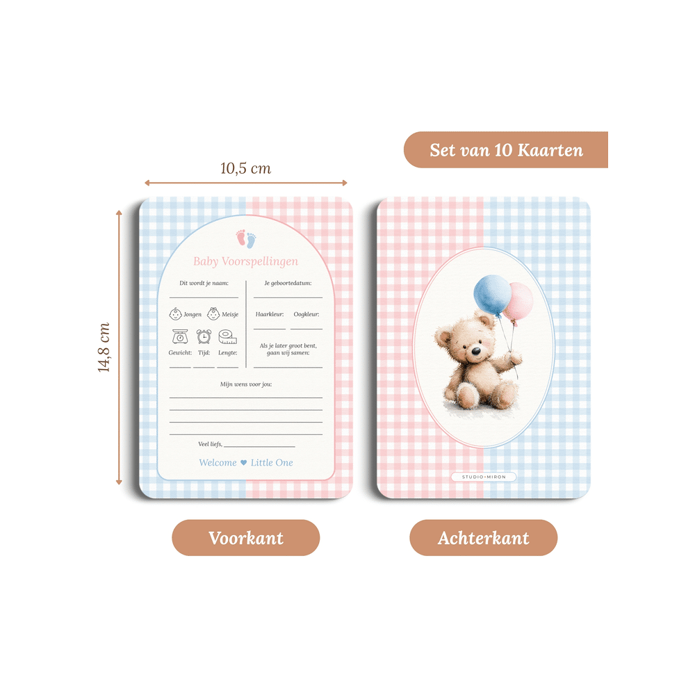 Met de Studio Miron Baby Voorspellingen Gingham Roze Blauw geef je jouw babyshower of kraamfeest een warme en persoonlijke toets. Deze set van 10 kaartjes nodigt gasten uit om hun voorspellingen en wensen te delen.