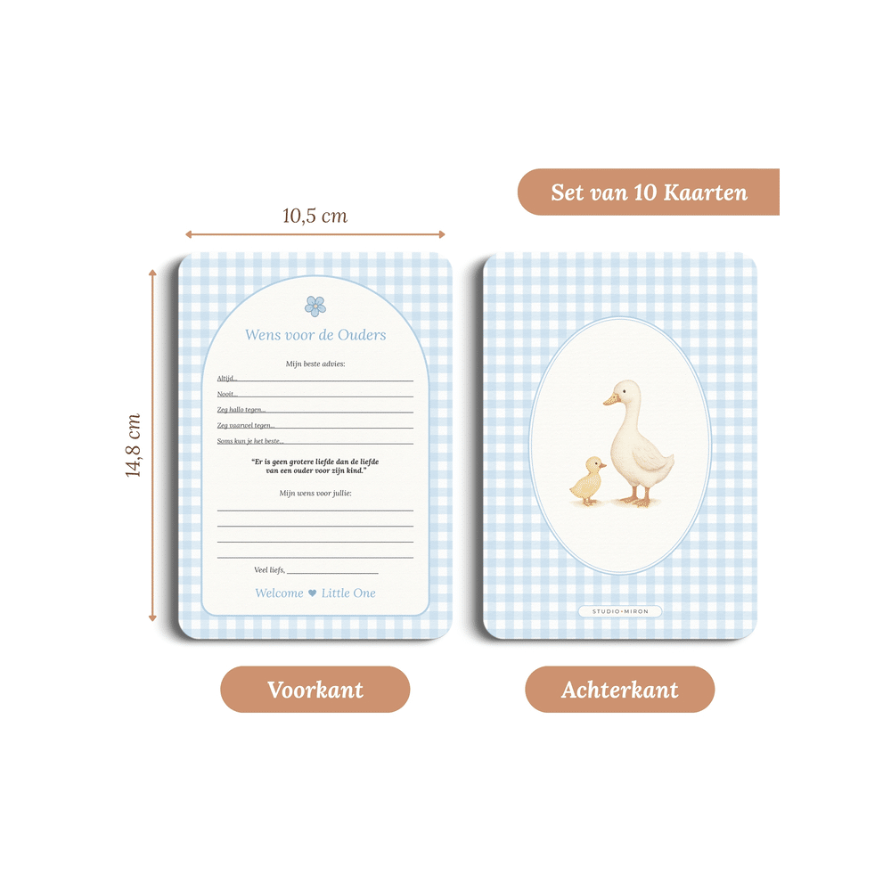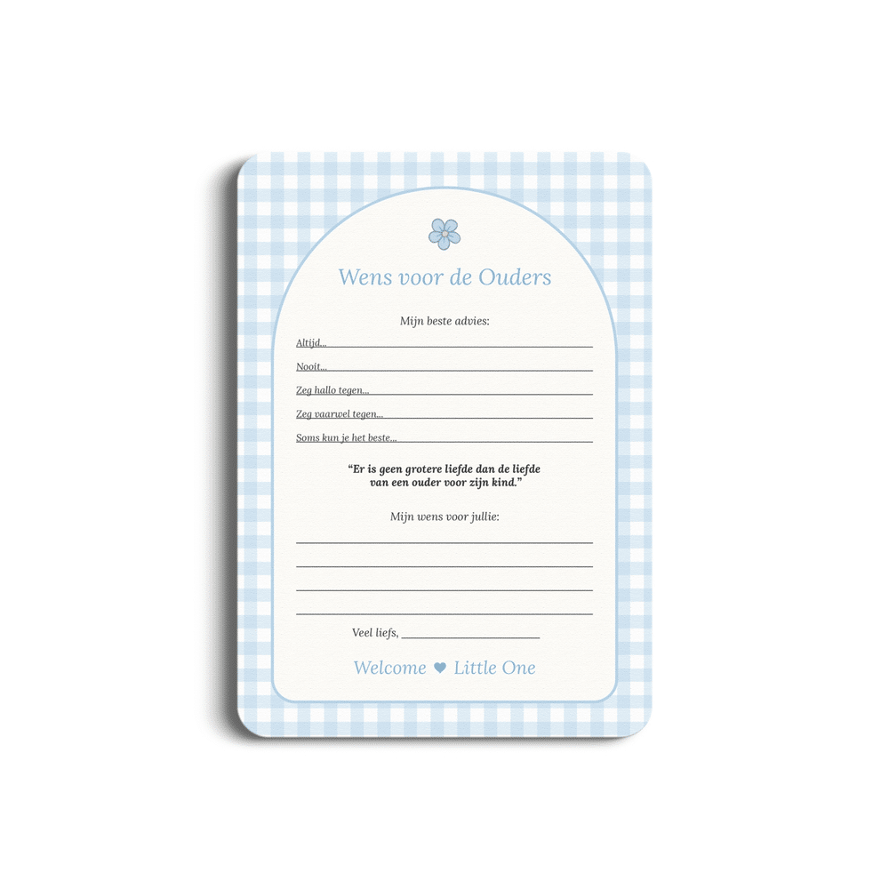 De Studio Miron Wens Voor De Ouders Gingham Blauw kaartjes nodigen vrienden en familie uit om hun mooiste adviezen en wensen te delen met de kersverse ouders. Perfect voor babyshowers of kraamfeesten en een waardevol aandenken.