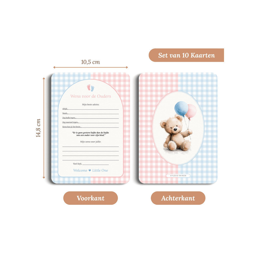 Met de Studio Miron Wens Voor De Ouders Gingham Roze/Blauw kaartjes deel je liefde, advies en warme wensen op een stijlvolle manier. Ideaal voor babyshowers en kraamfeesten, en een blijvende herinnering voor de ouders.