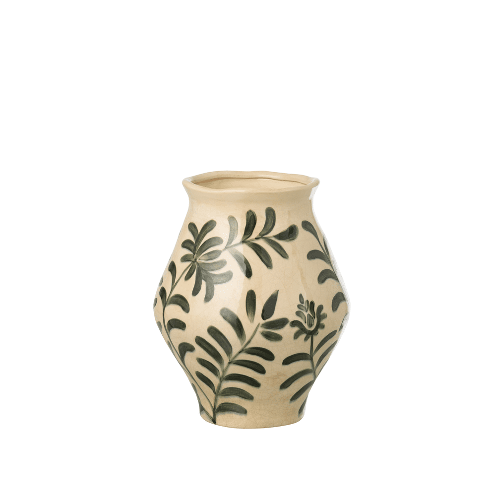 Deze vaas is gemaakt van steengoed en heeft een bladvormig design in groen en gebroken wit, waardoor het een opvallend en stijlvol element vormt in elke ruimte.