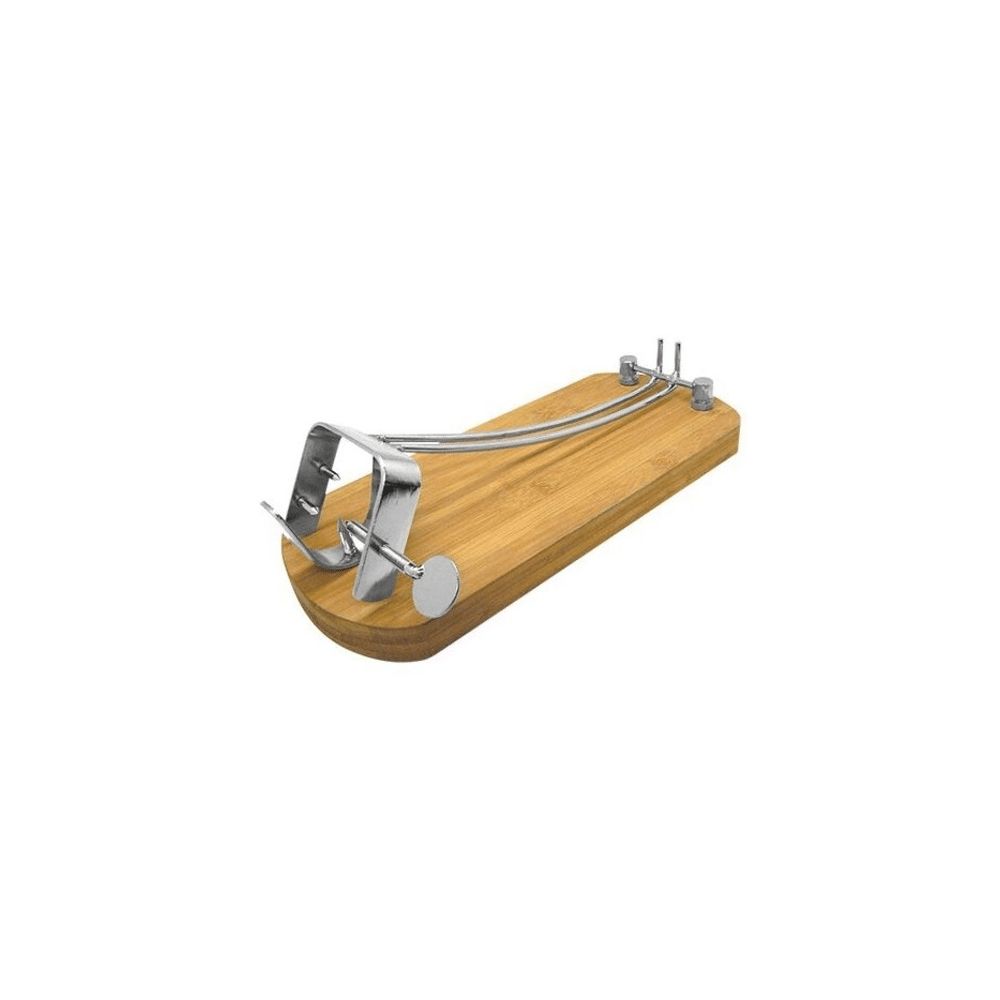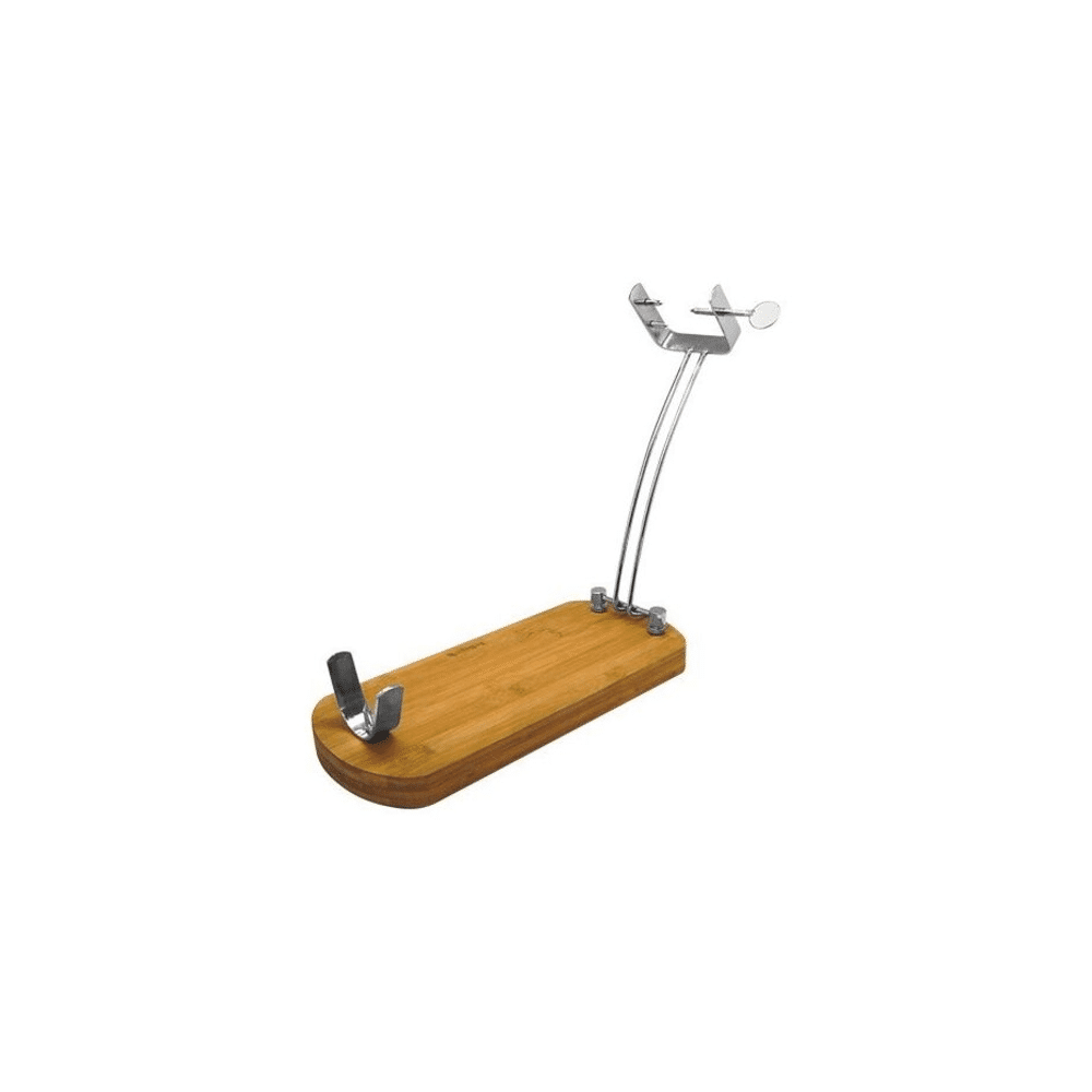 Plaats de ham stevig in de klem, fixeer het bot of stevige deel en positioneer de houder op een stabiele ondergrond. Snij vervolgens dunne plakjes met een scherp mes. Na gebruik spoel je het bamboe onder lauw water en droog je het goed om het materiaal mooi te houden.- Materiaal: warm bamboe – natuurlijke uitstraling