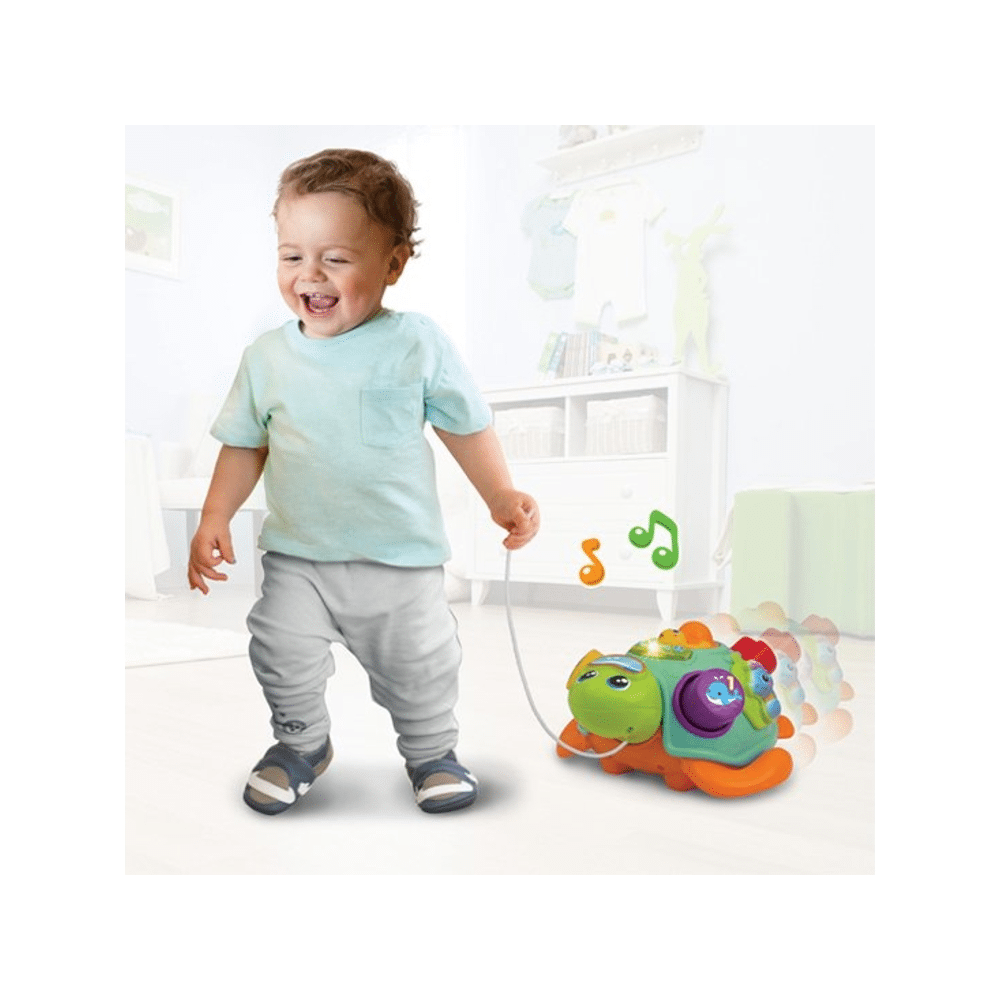 Trek de schildpad achter je kindje aan en ontdek de verschillende geluiden en bewegende figuurtjes.- Bevordert loop- en kruipvaardigheden