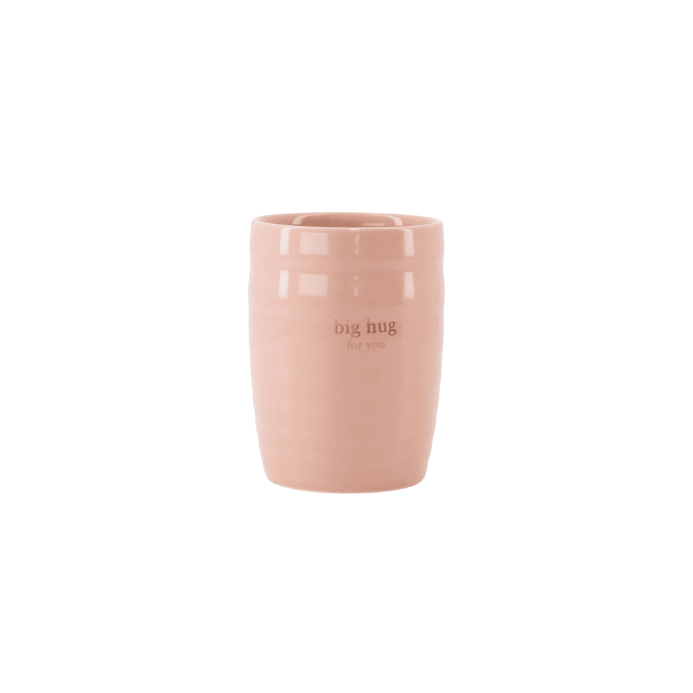 • Koffiemok in roze en oker met tekst “Big Hug For You”