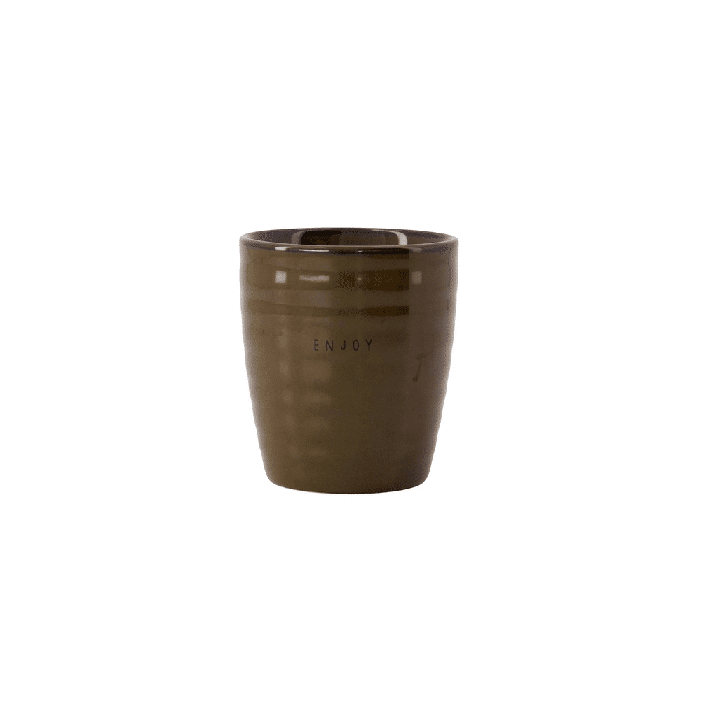 • Koffiemok in bruine kleur met tekst “Enjoy”