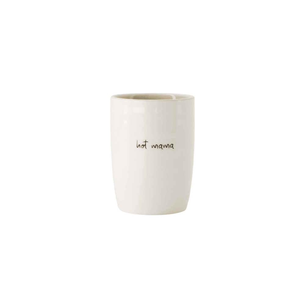 • Koffiemok in wit met zandkleurig en zwart accent en tekst “Hot Mama”
